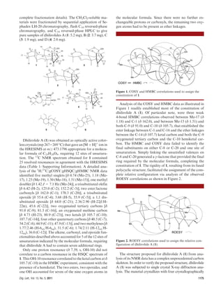 The document describes the isolation and characterization of four new meroterpenoid metabolites, dhilirolides A-D, from cultures of the fungus Penicillium purpurogenum collected in Sri Lanka. Dhilirolides A-D have unprecedented carbon skeletons containing dhilirane or isodhilirane rings. Dhilirolide A was characterized by NMR and X-ray crystallography, confirming its complex structure. Dhilirolides B-D have similar structures to A but differ in oxidation states or positions of double bonds, as elucidated by NMR. The dhilirolides represent a new class of fungal secondary metabolites with potential biomedical applications.