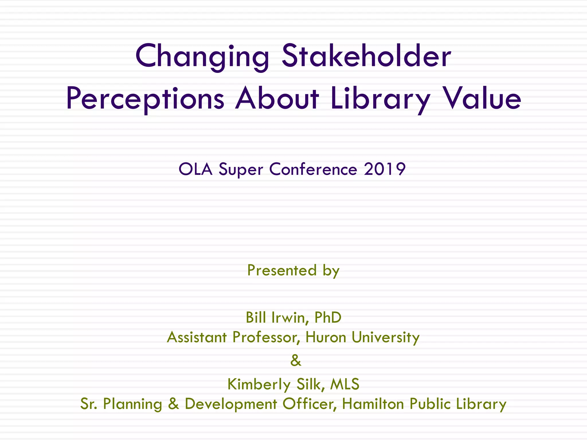 This presentation discusses changing stakeholder perceptions about library value by moving beyond traditional metrics like circulation and attendance to more meaningful metrics. It notes the unintended consequences that traditional metrics can have, like libraries focusing on metrics over services or stakeholders making decisions based on metrics alone. The presentation recommends identifying metrics specific to each community's needs and conditions, and engaging stakeholders at all levels in selecting and understanding the purpose of metrics to reflect the library's true social impact and value to the community. It emphasizes the importance of meaningful metrics over economic metrics alone and adapting measurement gradually with stakeholder input.