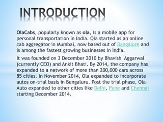 OlaCabs is a popular mobile app for transportation in India. Founded in 2010, it started as an online cab aggregator in Mumbai and is now headquartered in Bangalore. Ola connects users to over 200,000 cabs across 85 cities in India and provides services ranging from economical to luxury transportation options through their mobile app or website. It has received over $600 million in total funding. In 2015, Ola acquired TaxiForSure, expanding its network further.