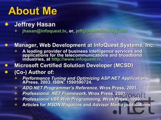 This document summarizes a talk on building a browser-based OLAP reporting solution using SQL Server 2000 Analysis Services, Microsoft Office XP Web Components, and ASP.NET. It discusses configuring an OLAP data source over HTTP, using the PivotTable component to create interactive reports, and delivering XML data to the browser. The speaker's qualifications and a new book on ASP.NET performance are also mentioned.