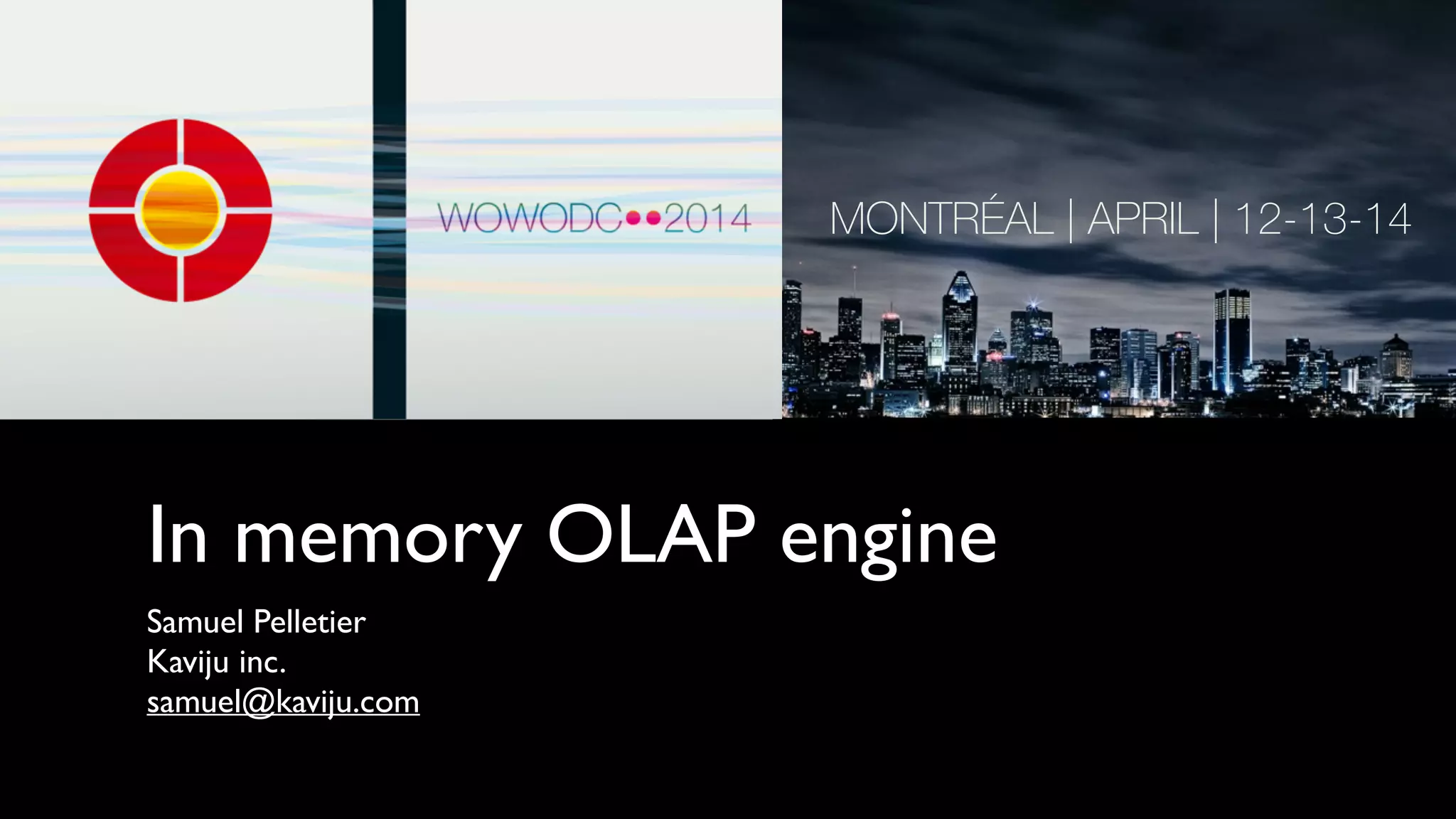 The document describes an in-memory OLAP engine created by Samuel Pelletier to enable fast querying of multidimensional data with millions of facts. It loads data into memory as plain old Java objects (POJOs) for faster access compared to entity objects or SQL queries. Dimensions are modeled as classes to index the facts and compute summarized results. The engine is multithreaded and designed for simplicity and minimal dependencies.