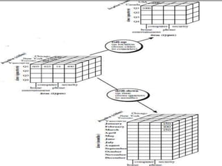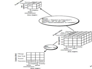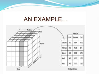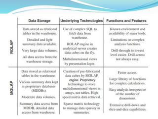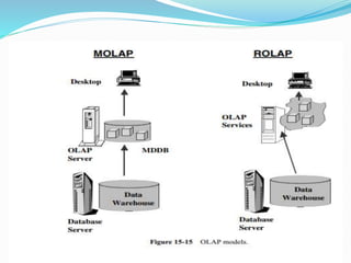The document discusses the implementation, design, and architecture of data warehouses, highlighting the importance of online analytical processing (OLAP) for multi-dimensional analysis and complex calculations. It addresses the limitations of traditional data analysis tools and the need for specialized OLAP systems to facilitate efficient decision-making. Additionally, it outlines different OLAP server types and the three-tier architecture of data warehouses, which includes data sources, OLAP servers, and client tools for querying and reporting.