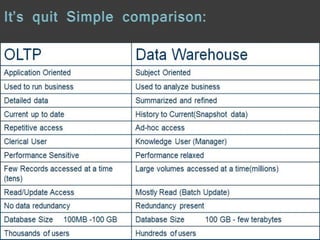 A data warehouse uses a repository to store aggregated, historical data from multiple OLTP databases in a multidimensional schema for online analytical processing (OLAP) through complex queries. In contrast, OLTP systems have detailed, current transactional data stored in a normalized schema to support a large volume of simple queries and updates for daily business tasks. While both involve databases, OLTP focuses on real-time transactions while OLAP supports analysis, planning and decision making through consolidated data from OLTP systems.