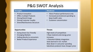The document presents an analysis of the fast-moving consumer goods (FMCG) sector in India, which is growing at 27% and is projected to reach $103.7 billion by 2020, with Procter & Gamble (P&G) as a key player in the personal care segment. It outlines P&G's historical milestones, market position, competitor landscape, and provides a SWOT analysis highlighting strengths, weaknesses, opportunities, and threats. Financial metrics indicate a decrease in profit ratios in 2019 and rising costs, necessitating strategic adjustments to improve profitability.