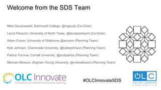 The document outlines the agenda and activities for the OLC Innovate Solution Design Summit held on April 19, 2016, including team introductions and various sessions focused on critical success factors, Q&A, networking, and pitch preparation. It highlights different cohort-specific discussion topics aimed at improving online learning environments and faculty engagement. The summit concludes with pitch sessions and awards, encouraging collaboration and innovation in educational solutions.