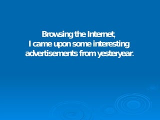 The document presents a collection of advertisements from the past that have aged poorly or take on different meanings today. Some promoted questionable medical treatments or products while others reflected social attitudes that are no longer widely accepted. The brief snippets transport the reader back in time while also highlighting how views and standards have evolved over the decades.