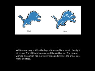 The document discusses several logo redesigns, providing opinions on changes made. It notes that Sprint merged its logo with Nextel's color scheme and symbol. The UPS redesign feels more modern though the 3D effects are disliked. Chicago's new logo features gradients representing the sunset and lake, borrowing from the city flag. Delta's redesigned logo is sharper with more subdued colors and sans serif typeface. BP's redesign transforms its shield logo into a colorful flower.