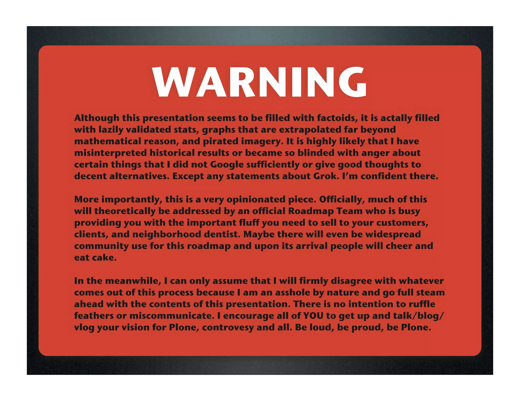 The document discusses modernizing Plone to improve the developer experience for Plone 5. It notes that Plone 4 focused on modernizing the user experience, but Plone 5 should focus on the developer experience by improving documentation, code quality, and community culture. The complexity of Plone is justified by its large and powerful feature set, but the new Dexterity content types system could help reduce complexity. The framework values of Plone should include easy debugging, extensibility, and clear, simple APIs.