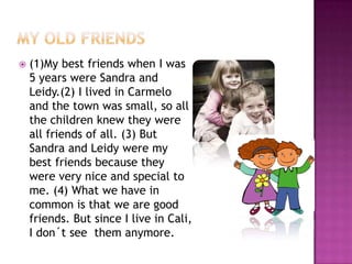 Yolanda reminisces about her old friends from childhood, Sandra and Leidy. She lived in a small town called Carmelo where all the children were friends. However, Sandra and Leidy were her best friends because they were very nice and special to her. Now since Yolanda has moved to Cali, she no longer sees them.