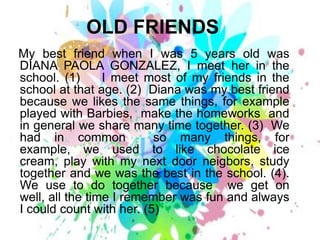 Diana Paola Gonzalez was Angie's best friend when they were 5 years old. They met in school and enjoyed doing many activities together like playing with Barbies, doing homework, and sharing time. They had many common interests like liking chocolate ice cream, playing with neighbors, and studying together. Angie remembers their time together fondly and could always count on Diana.