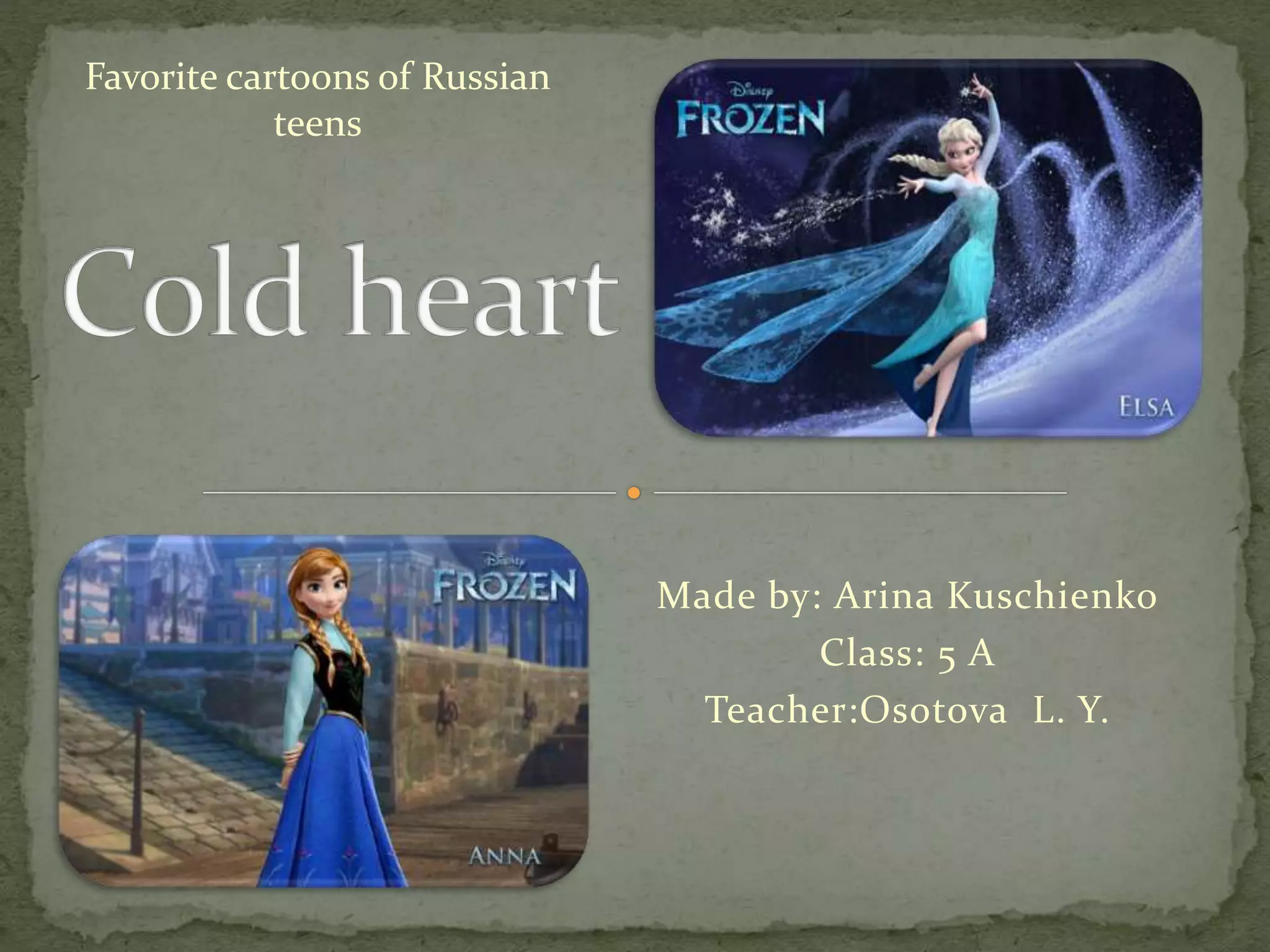 This document summarizes a favorite Russian teen cartoon called "Cold Heart" or Frozen. It discusses that the 2013 Disney film tells the story of Princess Anna and Queen Elsa, whose kingdom is struck by eternal winter after Elsa's ice powers are accidentally revealed. It recommends viewing the film for its fantasy, romance, and humor provided by the snowman character Olaf. Sources for the information are listed at the end.