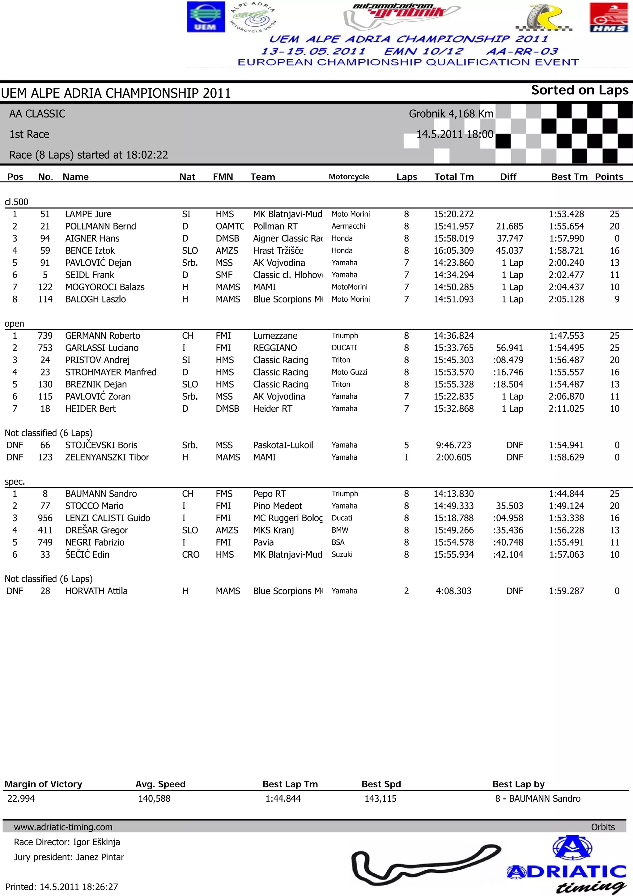 The document summarizes the results of a motorcycle race held on May 14, 2011 at the Grobnik track in Croatia. Jure Lampe of Slovenia finished first in the AA Classic 500cc class. Roberto Germann of Switzerland finished first in the Open class riding a Triumph. Sandro Baumann of Switzerland finished first in the Special class on a Triumph with a best lap time of 1:44.844.
