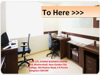 This document appears to be an address label for a business located at Suit# 175, EVOMA BUSINESS CENTRE #14, Bhattarahalli, Near Garden City College, Old Madras Road, K R Puram Bangalore 560 049 in Bangalore, India. The address includes the business name, building number, street address, nearby landmarks, and postal code.