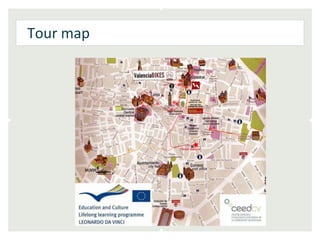 This document provides a tour guide of notable landmarks in Old Valencia, Spain. It includes 12 stops that highlight the Cathedral, churches, plazas, markets, and other historic buildings. Each stop provides brief background information and 1-2 questions about details of that location. The tour guide emphasizes the long history of the sites, many of which were built on top of earlier religious structures from Roman, Visigoth, Muslim, and Christian periods. It aims to educate visitors on the architecture and cultural significance of landmarks in Old Valencia's historic center.