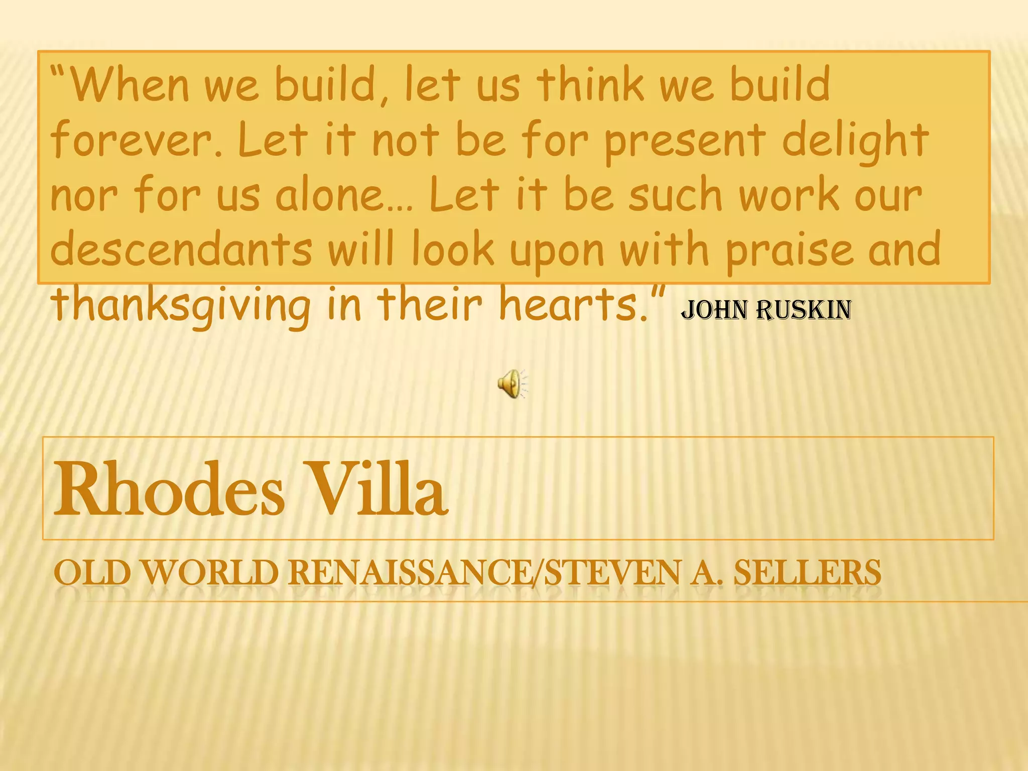 Old World Renaissance/StevenA. SellersRhodes Villa“When we build, let us think we build forever. Let it not be for present delight nor for us alone… Let it be such work our descendants will look upon with praise and thanksgiving in their hearts.” John Ruskin