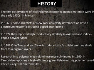 OLED (organic light-emitting diode) is a light-emitting diode made by placing a series of organic thin films between two conductors. When electrical current is applied, a bright light is emitted from a device that is 100 to 500 nm thick. There are different types of OLEDs including passive matrix OLEDs, active matrix OLEDs, and foldable OLEDs. OLEDs have advantages over traditional lighting like being lightweight, thin, flexible, more energy efficient, and having faster response times. However, their manufacturing processes are currently expensive and their organic materials have limited lifetimes. OLEDs are used in displays for phones, TVs, watches and can potentially replace traditional light bulbs