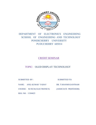 The document provides information about OLED display technology. It begins with an introduction to OLEDs, explaining that they are made of organic carbon-based films sandwiched between electrodes that emit light when electric current is applied. It then discusses the basic components and working principle of OLEDs, including the layers involved and how electrons and holes recombine to produce light. The document also outlines the different types of OLED displays, including passive matrix OLEDs, active matrix OLEDs, and transparent OLEDs. It provides details on each type and their uses and efficiencies.