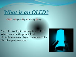OLEDs emit light when electricity is applied to a film of organic material. They have faster response times than LEDs and can be made transparent or flexible. An OLED is made of an emissive organic layer sandwiched between a cathode and anode. When voltage is applied, electrons from the cathode combine with holes from the anode in the emissive layer, emitting light. OLEDs are being used in TVs, phones, and other devices but have shorter lifetimes than LEDs, especially for blue colors.