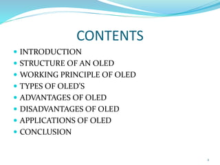The document discusses organic light emitting diodes (OLEDs). It describes the structure of an OLED, which consists of a cathode, emissive layer, conductive layer, anode and substrate. Electrons enter through the cathode and holes through the anode. When they combine in the emissive layer, light is emitted. OLEDs have advantages like lower power consumption, flexibility and thinness, but also disadvantages such as limited lifespan and sensitivity to damage. Potential applications of OLEDs include mobile phones, displays, medical devices and more.