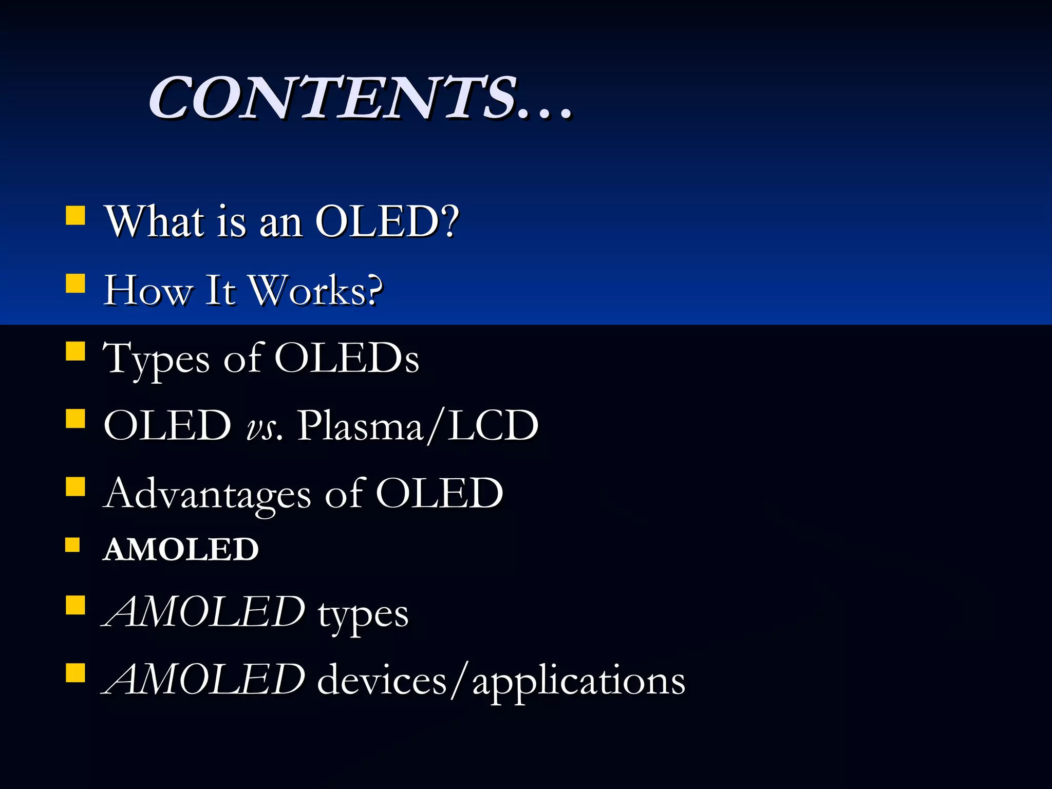 OLED (organic light-emitting diode) is a light emitting technology that uses organic compounds to emit light when an electric current is applied. It has advantages over LCD/plasma like higher contrast, thinner displays, and wider viewing angles. There are different types like passive matrix OLED and active matrix OLED. AMOLED is an active matrix OLED used in phones. AMOLED has advantages like true black, faster response time, and can be made flexible/transparent. Popular applications include phones, TVs, and lighting panels.