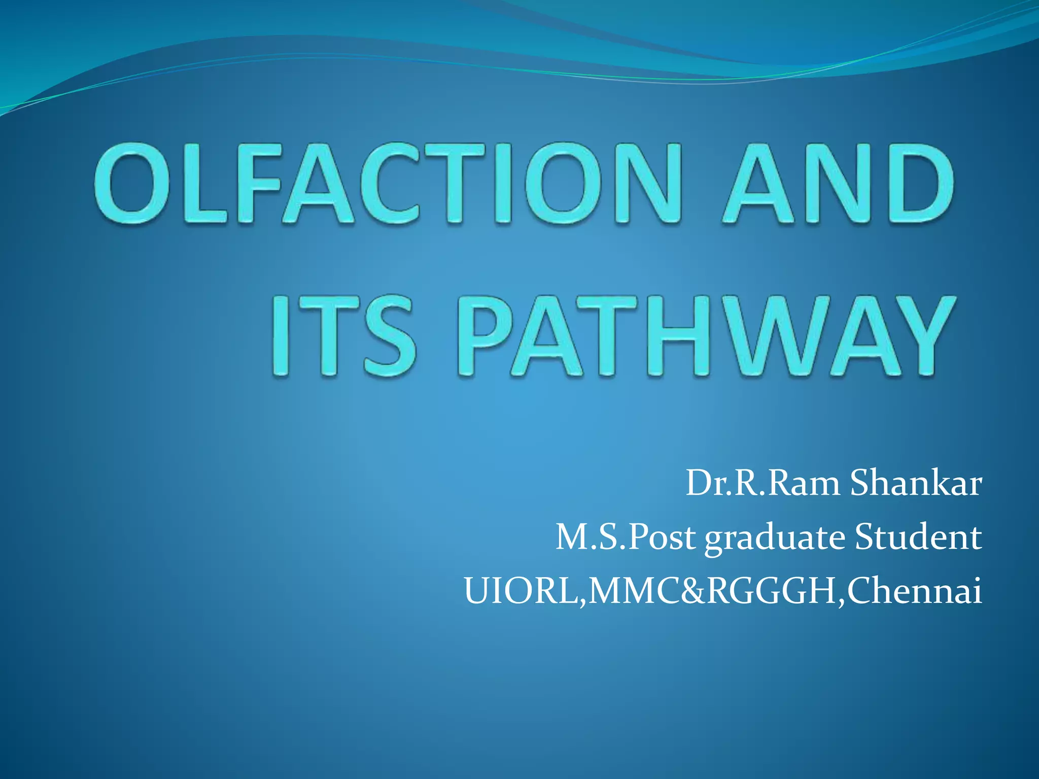 This document discusses the anatomy and function of the olfactory system. It notes that perception of odors depends on the state of the nasal epithelium and nervous system. It describes how odorant substances reach the olfactory cleft through diffusion or airflow in the nose. It outlines the structures involved in olfaction like the olfactory epithelium, receptor cells, and pathways in the brain. It also discusses clinical conditions that can affect smell and various diseases and medications that can impact the olfactory system.