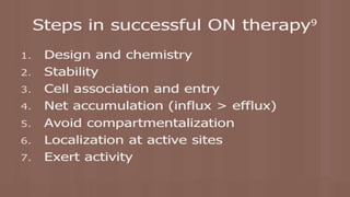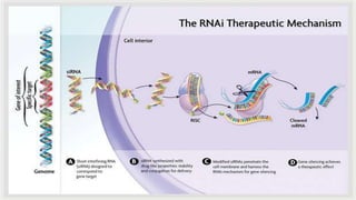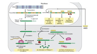 Oligonucleotides therapeutics work by altering gene expression through complementary binding to mRNA. There are three major classes: antisense oligonucleotides inhibit protein expression through hybridization to mRNA, siRNA induce mRNA degradation, and miRNA inhibit translation. Oligonucleotides are modified through conjugation or encapsulation to improve delivery and stability, and resist nuclease degradation. Antisense oligonucleotides specifically designed to hybridize with mRNA can function through RNase H degradation or steric blocking of translation.