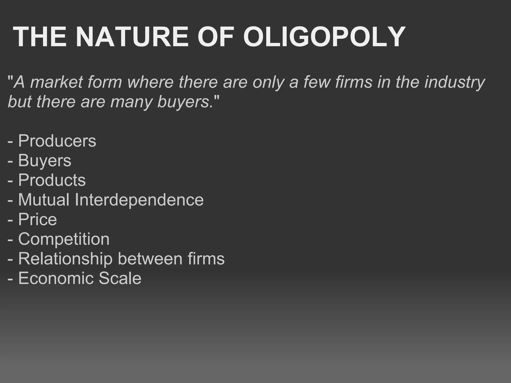 This document discusses the concept of oligopoly and provides examples. It defines oligopoly as a market structure with a few firms and many buyers. It notes that firms in an oligopoly are mutually interdependent and considers factors like price, competition, relationships between firms, and economic scale. It provides graphs to illustrate concepts like kinked demand curves and marginal revenue curves. It gives common examples of oligopolistic industries and compares oligopoly to monopoly, perfect competition, and monopolistic competition.