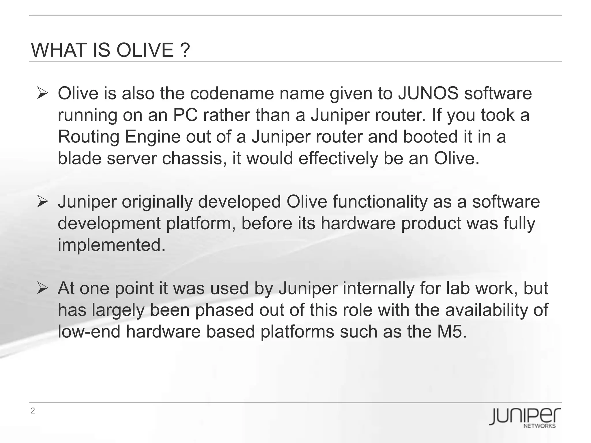 The document discusses Olive, which is the codename for JUNOS software running on a PC rather than a Juniper router. It was originally developed by Juniper as a software development platform before their hardware was fully implemented. The document also discusses logical routers, which allow a single physical router to be partitioned into multiple virtual routers. It provides instructions on configuring logical routers in the Olive VM, including assigning interfaces, enabling OSPF and BGP between the logical routers, and restricting configuration access based on logical router.