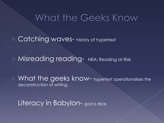 The document discusses the history and evolution of hypertext and its implications for literacy. It outlines three waves of hypertext development and argues that traditional understandings of literacy are inadequate for digital discourse. The author advocates redefining literacy based on navigation through nodes and links in a hypertextual archive, rather than print-based definitions of literacy. Examples are provided of early and modern hypertext applications like Wikipedia and an online story. The document questions how education can enable critical participation in an increasingly mediated world.