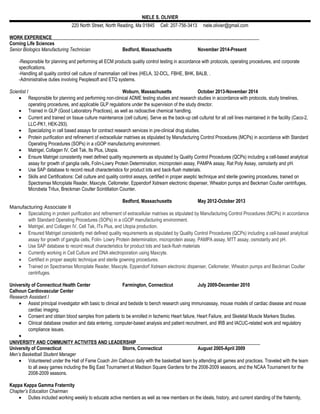 Niele Olivier has over 10 years of experience in biologics manufacturing and quality control testing. She currently works as a Senior Biologics Manufacturing Technician at Corning Life Sciences, where she is responsible for quality control testing and administrative duties. Previously, she worked at Corning as a Scientist I, focusing on non-clinical drug testing and cell-based assays. She also has experience manufacturing extracellular matrices and ensuring products meet quality standards. Olivier holds a bachelor's degree in Pathobiology from the University of Connecticut and is skilled in cell culture, protein purification, and quality control assays.