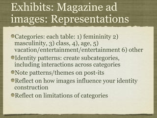 This document discusses various representations and identities in media. It examines how media does not simply reflect reality but constructs new realities through stereotypes and essentializing of groups. The text also analyzes how discourses shape understandings of categories like gender, race, and class by limiting meanings and silencing certain voices.