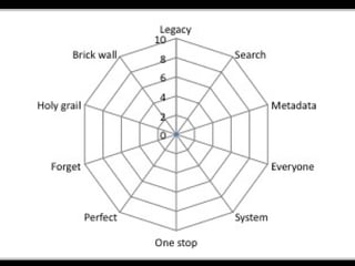 The document discusses various traps encountered in project management, including the legacy trap, search trap, and metadata trap. It emphasizes the importance of integrative evaluation to avoid these pitfalls. The insights are derived from a presentation by Patrick McAndrew, inspired by Chris Pegler.