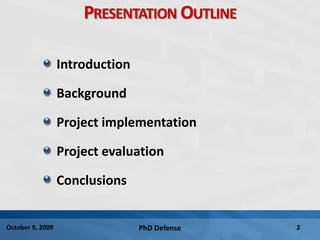 This document summarizes a PhD defense presentation on enhancing continuity of care using an emergency medical card and continuity of care report. The presentation outlines background on current fragmented healthcare systems and the importance of continuity of care. It then describes the implementation of a continuity of care record application integrated with an electronic patient portal to allow patients to create and print an emergency medical card and continuity of care report containing their medical information. Evaluation studies were designed to assess the usefulness of these tools in enhancing continuity of care using simulation and surveys. The presentation concludes that these tools have the potential to improve information sharing and medical decision making across healthcare providers if the information they contain is concise and validated.