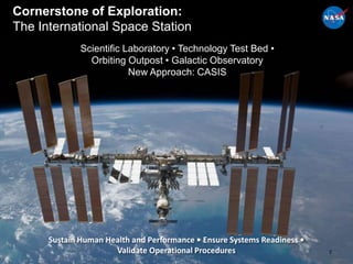 The document summarizes NASA's efforts to collaborate internationally on space exploration through organizations like the International Space Station and International Space Exploration Coordination Group. It discusses how the ISS serves as a scientific laboratory, technology test bed, and orbital outpost conducting over 1,200 experiments. The ISS has also helped develop closed-loop life support, medical monitoring, and other technologies. The International Space Exploration Coordination Group works to advance international cooperation on exploration goals through consensus. Their Global Exploration Roadmap outlines two pathways—one focusing on asteroids and another on the Moon—that ultimately aim to send humans to Mars. International partnerships are seen as essential to achieving these long-term exploration objectives.