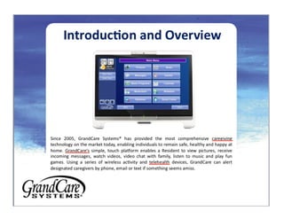 For professional and family care providers who care for chronically ill or frail patients, GrandCare is an internet device, web portal and secure server that provides telehealth, ADL monitoring, smart home features, communication and socialization in an integrated solution. Unlike other products, GrandCare is unique because it has a friendly, intuitive touchscreen interface and senior-oriented web content to engage users with no interest in computers.