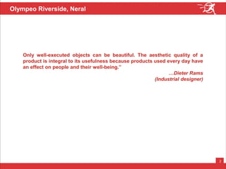 The document describes Olympeo Riverside, a proposed integrated township development in Neral, India. The development aims to create a community with enhanced social interaction and safety, ample green space, and amenities like a primary school, sports facilities, and retail plaza. The buildings are designed for natural light, ventilation, and insulation to reduce electricity bills, and the development emphasizes outdoor spaces, landscaping, and infrastructure to promote health, wellness, and child safety while minimizing maintenance costs.
