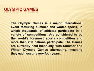 The Olympic Games is a major international sporting event held every two years that features both summer and winter sports. Over 200 nations participate in competitions across various sports. The first Olympic Games began in ancient Greece in 776 BC and featured a single footrace where winners received prizes like food and fame. Over time, additional sports were added to the Olympic program. Key symbols of the Olympics include the five interlocking rings and the torch relay.