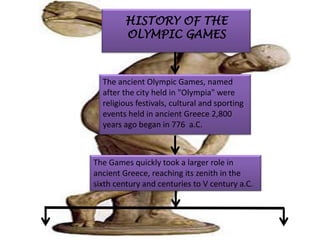The ancient Olympic Games began in Greece over 2,800 years ago as religious festivals and sporting competitions held in Olympia. They grew greatly in significance, reaching their peak in the 6th-5th centuries BC. The modern Olympics were revived in 1896 in Athens and have been held every four years in different host cities around the world since. London will host the 2012 Summer Olympics, the third time the city has held the Games.