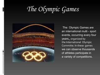 The Olympic Games are international multi-sport events held every four years, organized by the International Olympic Committee, and originated in ancient Greece to honor gods. Modern Olympics, initiated by Pierre de Coubertin, feature symbolic elements like the interlaced rings representing the five inhabited continents and medals for top performers. The Games include a variety of sports and disciplines, with host cities selected seven years in advance, showcasing their culture to the world.