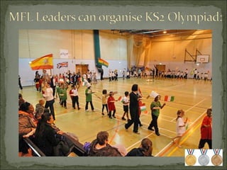 The document outlines plans for a primary languages program centered around the Olympics, featuring detailed lesson objectives, activities, and vocabulary learning strategies. It encourages student engagement through various Olympic themed tasks while promoting language skills intertwined with physical education. The document also includes links to resources and emphasizes the importance of interaction and cultural understanding.