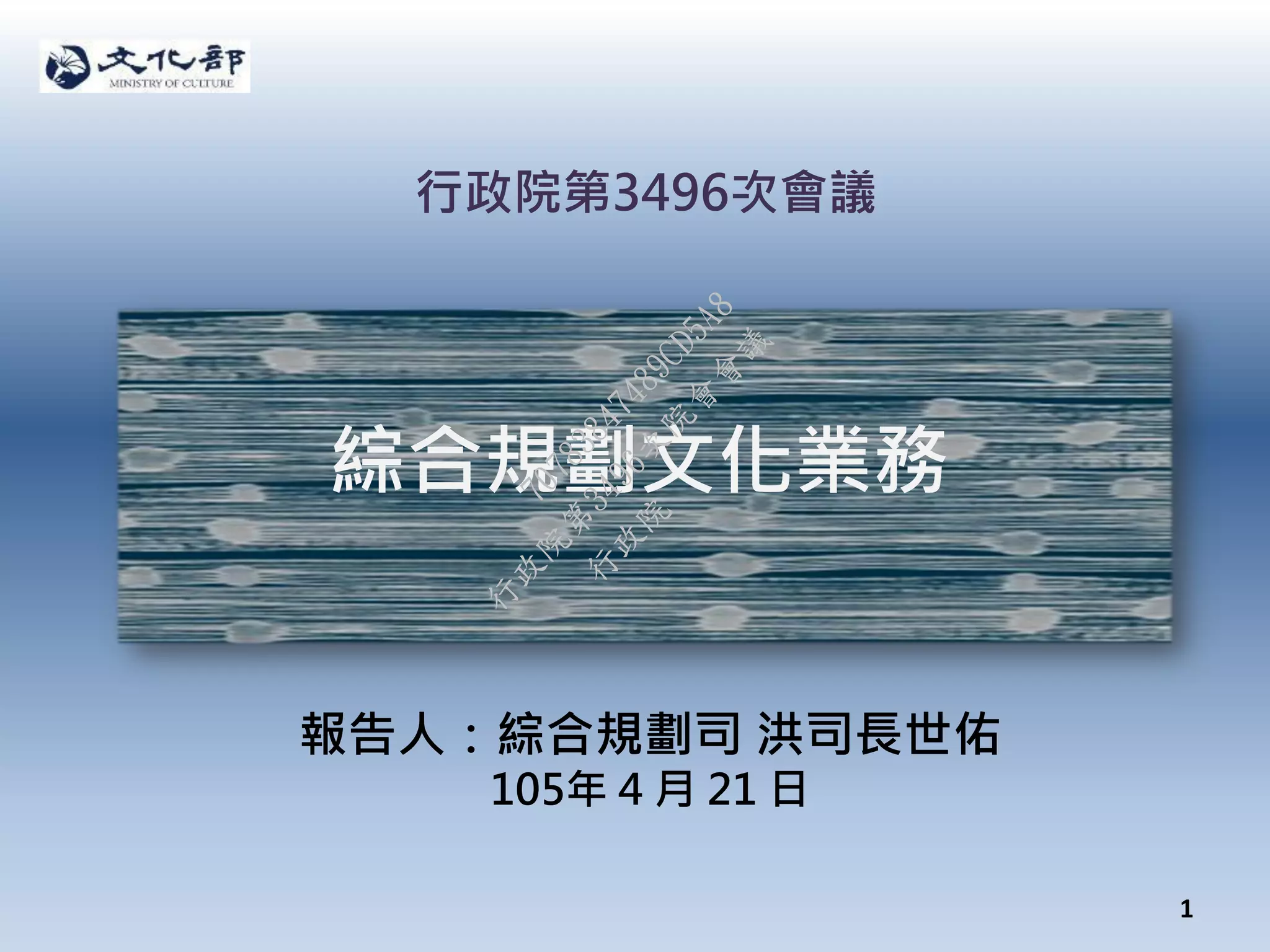 行政院於第3496次會議中報告了文化業務的重要成果及未來展望。文中介紹了文化法規的更新、重要文化設施的營運及建設情況,以及文化資產的管理和保存計畫。並強調了深耕藝文和提升文化內涵的重要性,透過社區參與和文創產業推進文化發展。