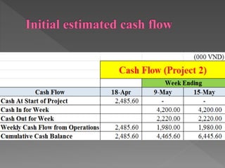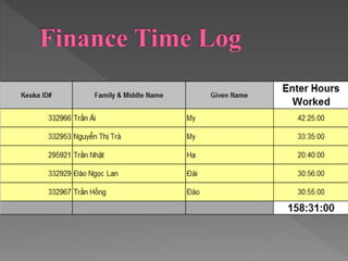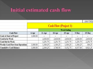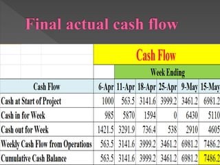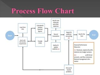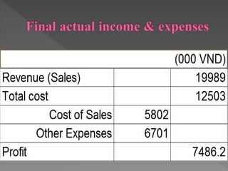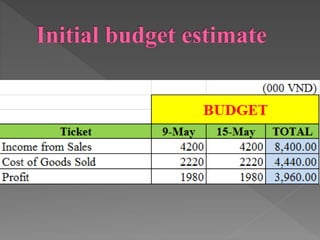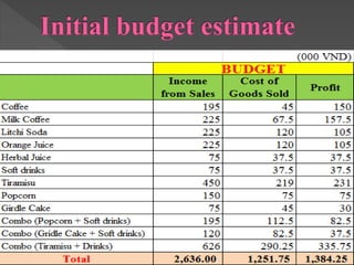 This document outlines the responsibilities and activities for managing the finances of a bakery and drinks department. It includes collecting financial information, estimating expenses and budgets, managing data, and reporting on income and expenses. A table shows the revenue from various food and drink items. The document also reflects on lessons learned, such as the importance of planning, communication, and flexibility.