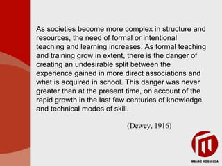 As societies becomemore complex in structure and resources, the need of formal or intentional teaching and learning increases. As formal teaching and training grow in extent, there is the danger of creating an undesirable split between the experience gained in more direct associations and what is acquired in school. This danger was never greater than at the present time, on account of the rapid growth in the last few centuries of knowledge and technical modes of skill. (Dewey, 1916)