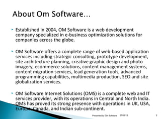 OM Software is a web development company established in 2004 that specializes in e-business optimization solutions. It offers a range of web-based application services including strategic consulting, design, development, and content management. With over 100 employees globally, OM Software has operations in Central and North India as well as the UK, USA, Europe, Canada, and other parts of the Indian subcontinent. The company provides solutions such as custom web portals, mobile applications, and enterprise content management to help clients optimize their online presence and business processes.