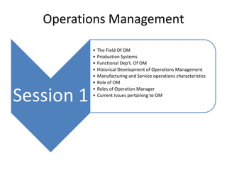 The document discusses key topics in operations management, including the roles and functions of operations managers, historical developments in the field, characteristics of manufacturing and service operations, and current issues facing operations management such as globalization, technology, the environment, and supply chain management. It provides definitions and descriptions of operations management, production systems, and the various departments involved in managing business operations from a strategic to tactical level.