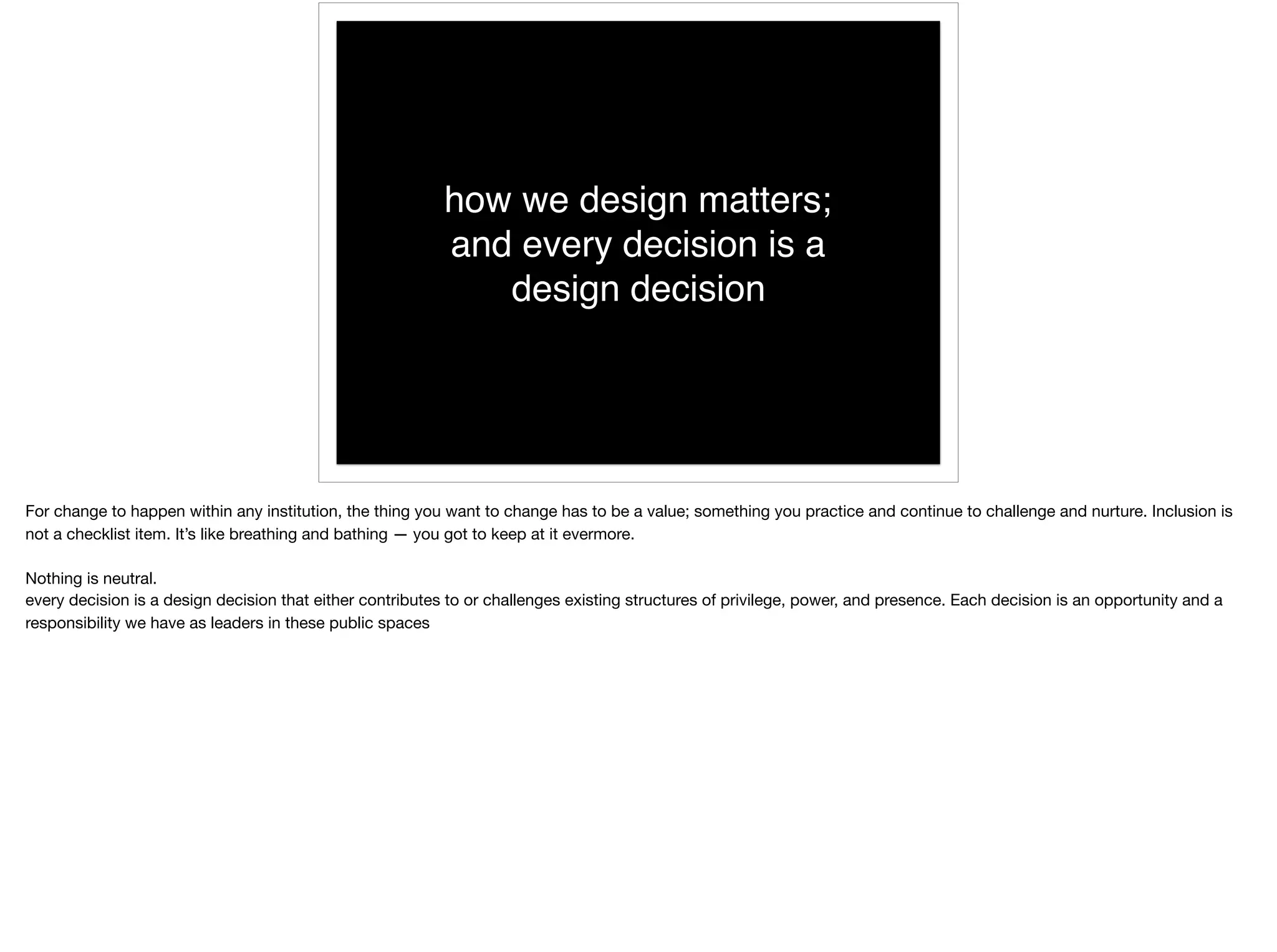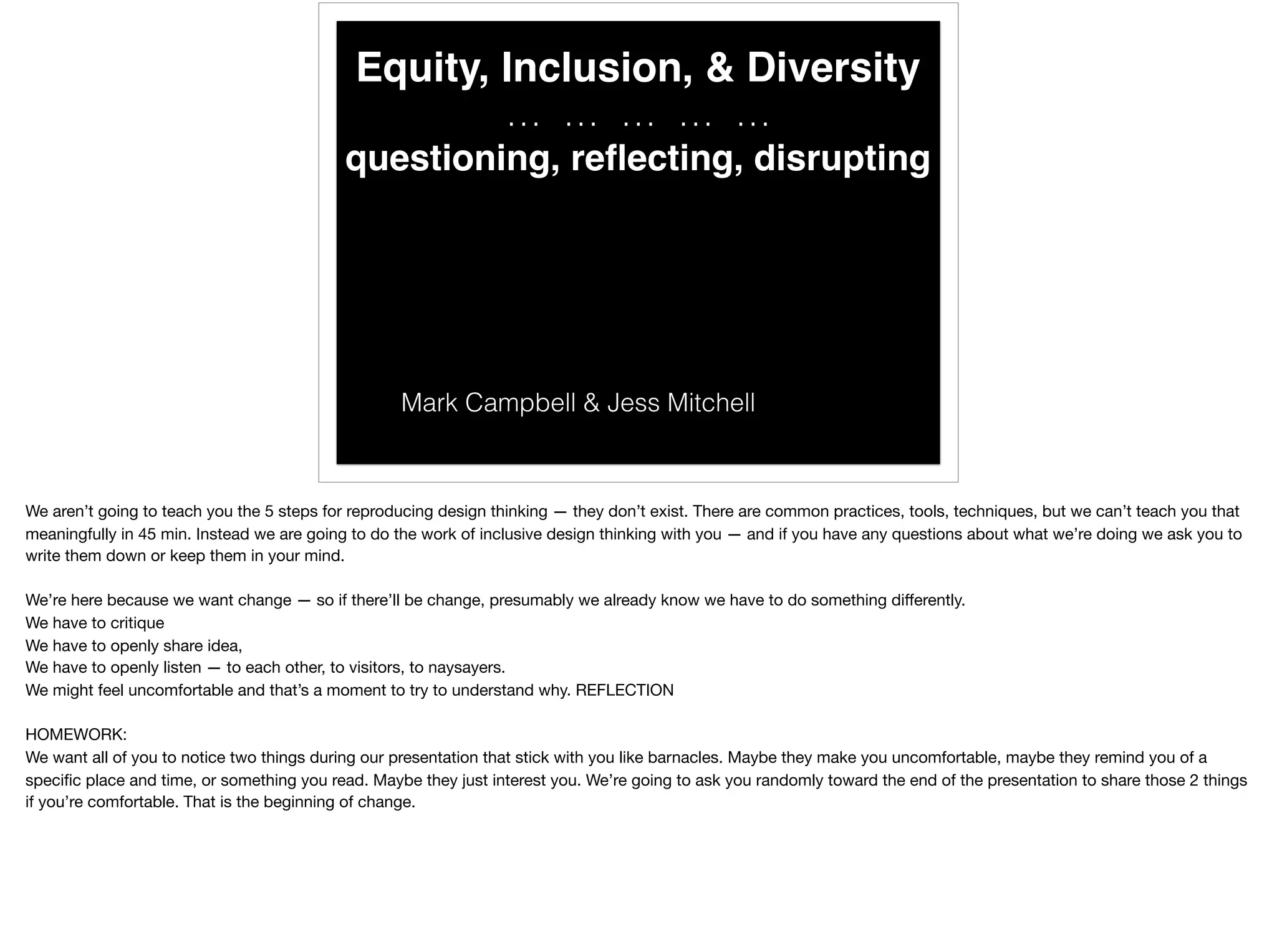 This document summarizes a presentation about inclusive design thinking. It encourages attendees to critically question, reflect on, and disrupt existing structures to promote equity, inclusion, and diversity. The presentation uses examples from architecture, experiences, and interactions to show how design decisions impact people. Attendees are asked to note two things that make them think or feel uncomfortable and consider how they can question, reflect, and disrupt in their own work to design more inclusively.