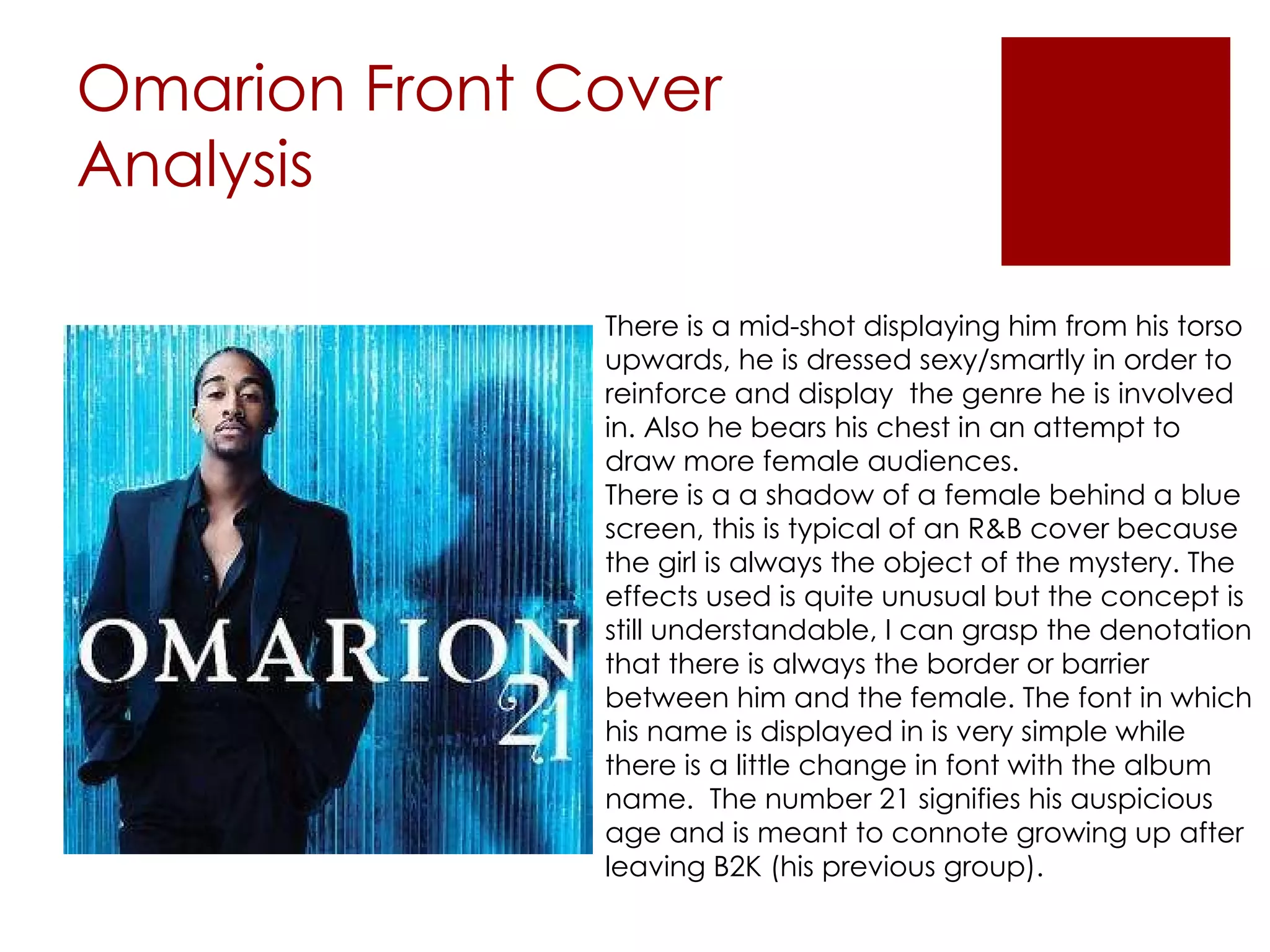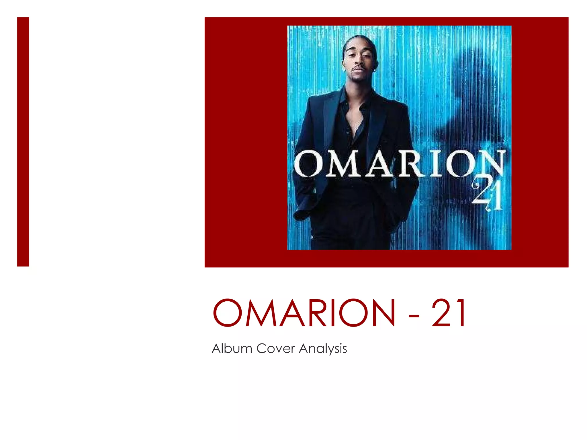 Omarion's album covers are analyzed. The front cover of his "21" album shows him from the torso up, dressed stylishly to represent R&B. A shadow of a woman hints at romance. The cover design conveys a barrier between him and the woman. His name is simple while the album title has a different font. The number "21" signifies his age and maturity past his previous group. The back cover has varied colors and basic design, still showing his growth. Font colors contrast his clothes. Production details are included but it is less detailed than other covers. His "O" album cover has a simple black and white design. The "O" represents his name with a crown. Font colors are