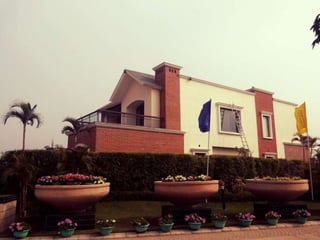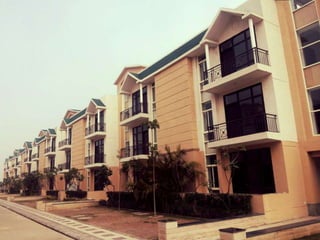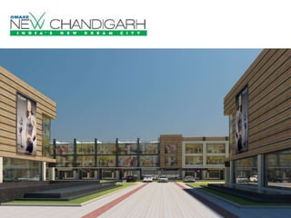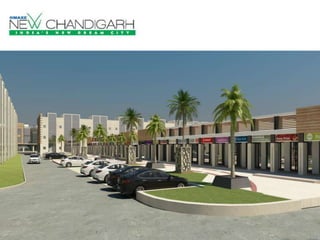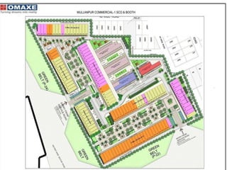 The document presents a development project at Omaxe residential area featuring independent floors, plots, and Mulberry villas, aimed at serving around 3000 families. It highlights the unique design of the commercial area, including features like dual entry, spacious corridors, and options for basements in booths. Contact information is provided for further inquiries regarding the project.