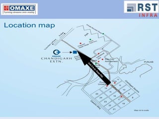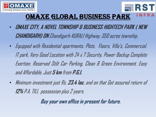Omaxe Global Business Park is a 350-acre township and business high-tech park located on the Chandigarh-Kurali highway, featuring residential and commercial spaces with 24/7 security and power backup. Minimum investment starts at Rs. 23.4 lakh, with a 12% assured return per annum until possession and 2 years after. The project includes grade 'A' office spaces, modern amenities, and various facilities like a gym, bank, and medical center.