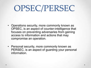 This document provides information on operations security (OPSEC) and personal security (PERSEC) for families of deployed service members. It advises keeping routines and displays normal to avoid signaling an absence, avoiding sharing sensitive information via communication or social media, and practicing safety measures like situational awareness in public. Maintaining security protects operations and prevents adversaries from gaining information that could endanger service members or their families.